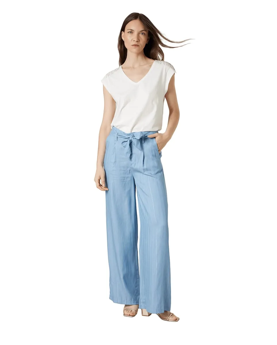 Le pantalon DEELUXE BELIZA en lyocell est l'allié parfait pour un style estival à la fois décontracté et élégant. Sa coupe à jambes larges et son tissu fluide et respirant offrent un confort optimal tout au long de la journée. Avec sa taille haute ajustable grâce à une ceinture à nouer, il met en valeur la silhouette tout en garantissant une grande liberté de mouvement. Ses quatre poches, dont deux passepoilées à l'arrière, allient praticité et esthétique. Confectionné dans un bleu profond, ce modèle polyvalent s'accorde aussi bien avec un top léger qu'avec une blouse plus habillée pour des tenues variées.