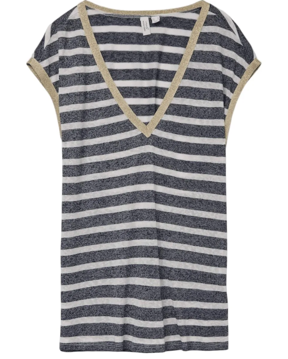 Craquez pour ce t-shirt Vero Moda, une pièce tendance qui marie confort et style contemporain. Confectionné dans un mélange de viscose et de polyester, ce haut offre une matière douce et fluide qui épouse naturellement la silhouette. Son col en V chic, son imprimé rayé et ses détails pailletés métalliques apportent une touche lumineuse à vos looks. Idéal avec un jean denim ou une jupe fluide, ce t-shirt casual chic enrichit votre dressing d’une note moderne et facile à porter.