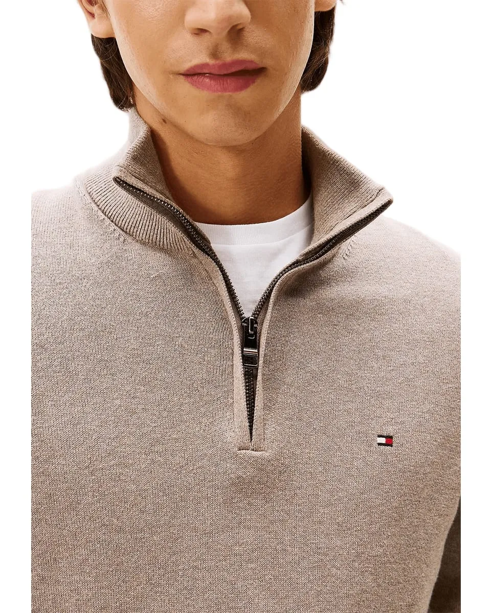 Pull col zippé Homme PIMA ORG CTN CASHMERE ZIP MOCK Taupe Chiné TOMMY HILFIGER - Ref MW0MW28049-HI3